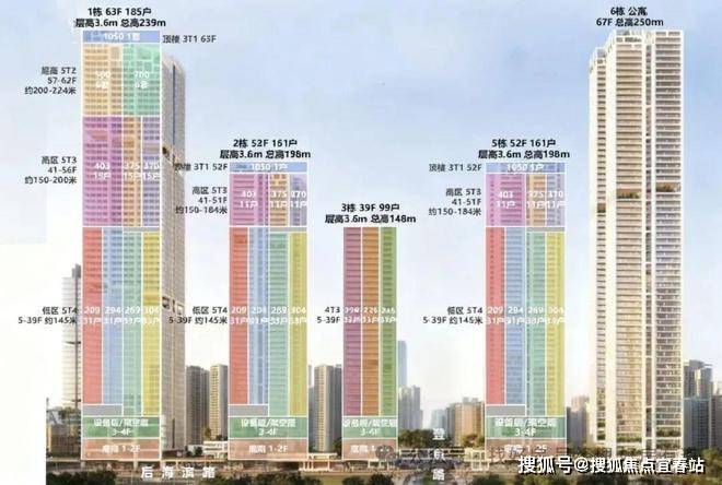 项目规划5栋超高层住宅,采用全玻璃幕墙设计,实用率超95%,主力户型为209㎡以上大平层。项目以“第四代住宅”标准打造,配备空中连廊、星空会所、架空泳池等共享空间,并融入垂直绿化体系