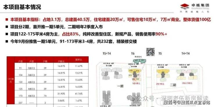 项目一期:6栋住宅,7万平商业,732套可售住宅,91-173平3-4房,户型使用率超90%。