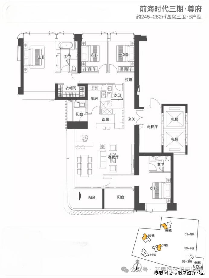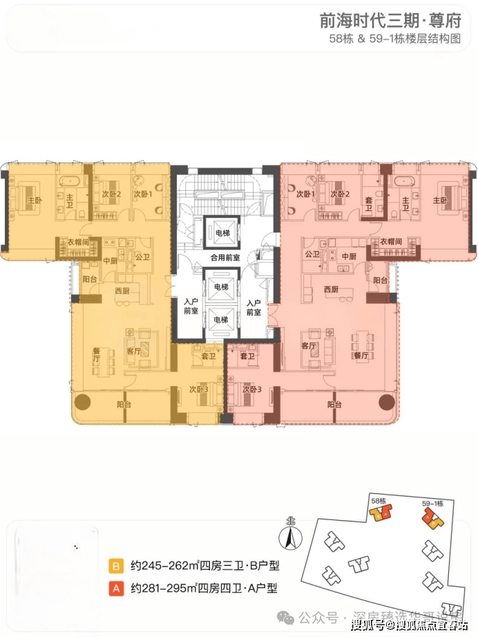 从户型配置来看:59-1栋:3梯2户,262㎡+295㎡组合