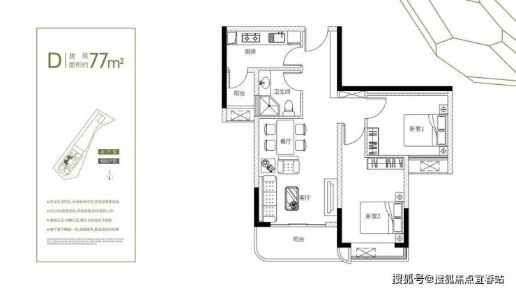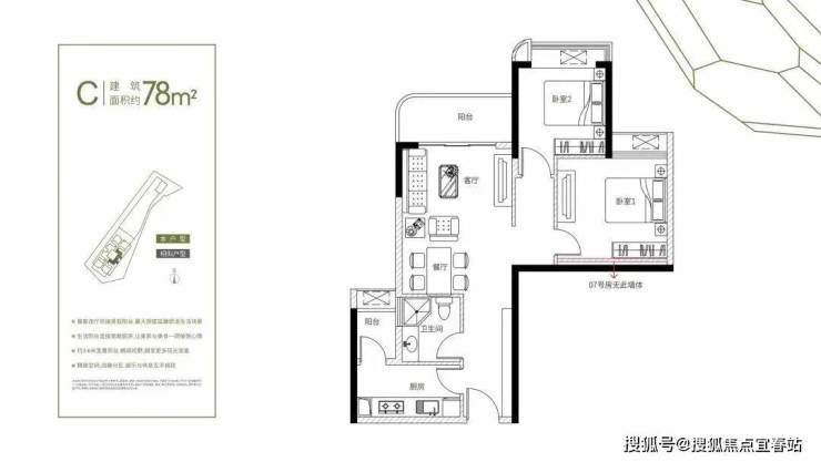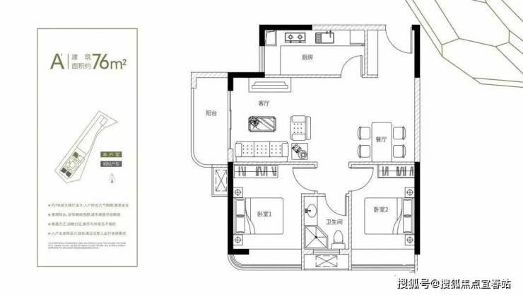 建筑面积约76-78㎡2房+1卫(灵活多变+1多功能空间)