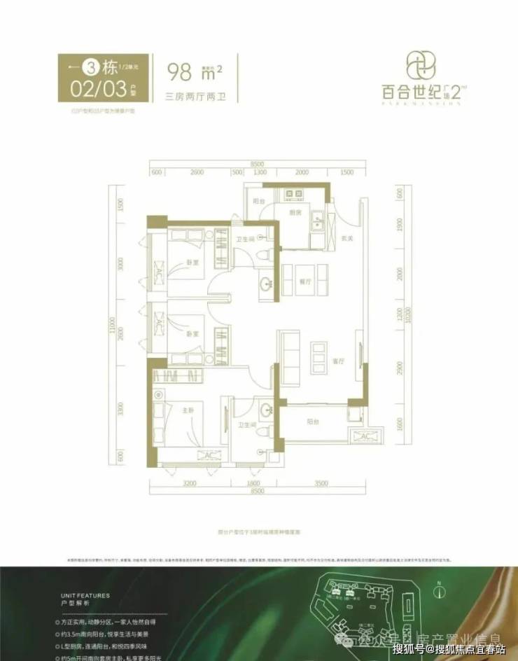 98㎡的3房2厅2卫,3栋02/03户型,设计的是竖厅格局,进门入户玄关客厅3.5米开间,LDKB一体化设计,三开间朝南,动静分区,得房率约76%(不含赠送),正南朝向。套内面积74.48㎡+赠送9.05㎡=实得83.53㎡,加上赠送得房率约85.23%。