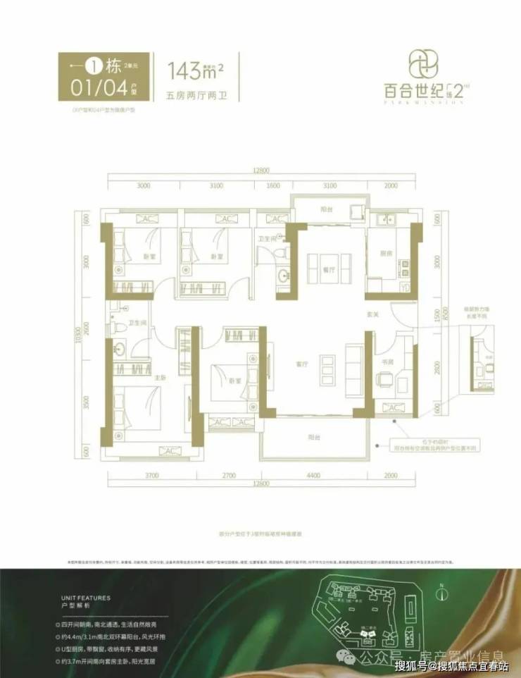 143㎡的5房2厅2卫,3栋1单元04/3栋2单元01户型,设计的是竖厅南北通透格局,进门入户玄关,客厅4.4米开间,客餐厅分离设计,南北双阳台,得房率约76%(不含赠送),阳台主朝西南或东南向。套内面积108.68㎡+赠送17.22㎡=实得125.9㎡,加上赠送得房率约88.04%。