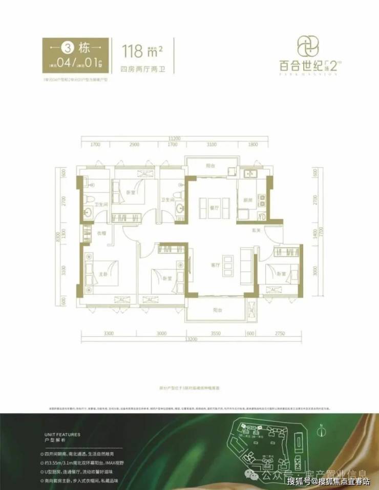 118㎡的4房2厅2卫,3栋1单元04/3栋2单元01户型,设计的是竖厅南北通透格局,进门入户玄关,客厅4.15米开间,客餐厅分离设计,南北双阳台,得房率约76%(不含赠送),阳台主朝西南或东南向。套内面积89.68㎡+赠送15.44㎡=105.12㎡,加上赠送得房率约89.08%。