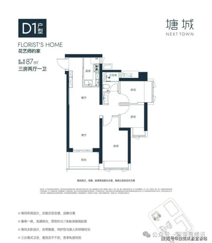 87㎡的3房2厅1卫,D1户型,5栋1单元01/04户型,设计的是竖厅格局,进门入户玄关,客厅3.3米开间,约10.7米纵深,三开间朝南,得房率约80%(包含赠送),东南朝向。