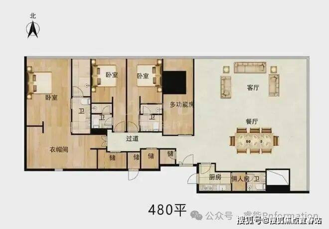 480平3+1房 3+1房(三套房)客厅105平,主卧65平奢阔设计。