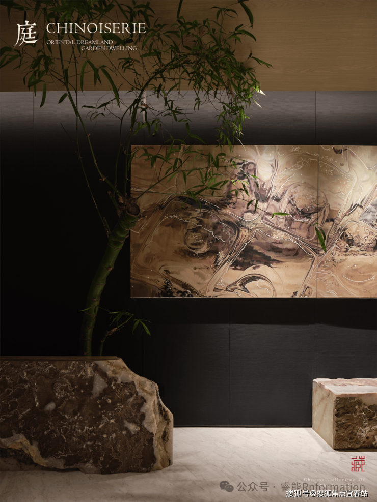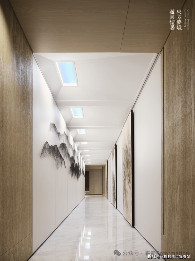 以东方手法“入园”为情境,艺术长廊以“造影”为灵感,将山石、植物、雕塑等庭院感受的人文感官引入室内。
