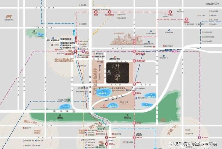 ①双枢纽(深圳北站+五和站),1小时无缝对接大湾区;五和站城际枢纽,5/10号线及规划中的深大、深惠、深广中轴城际。