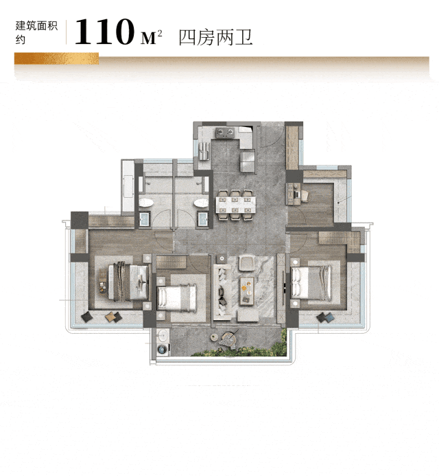 3个次卧既能满足多孩家庭需求,又能用作兴趣间、书房等,随家庭需求而变化,使用灵活。