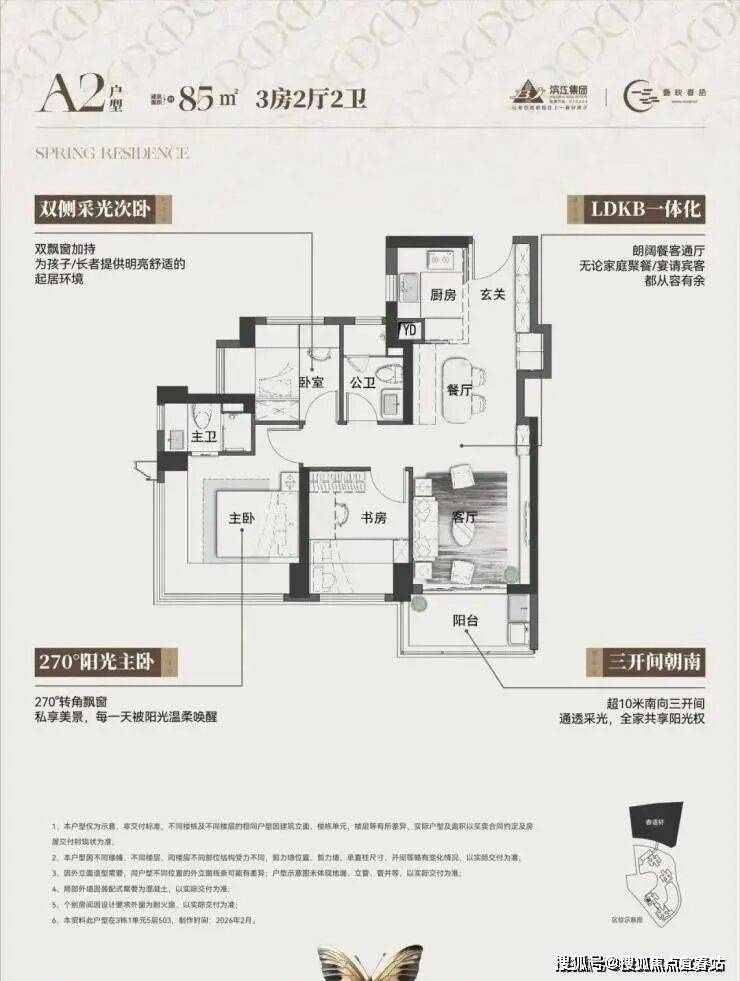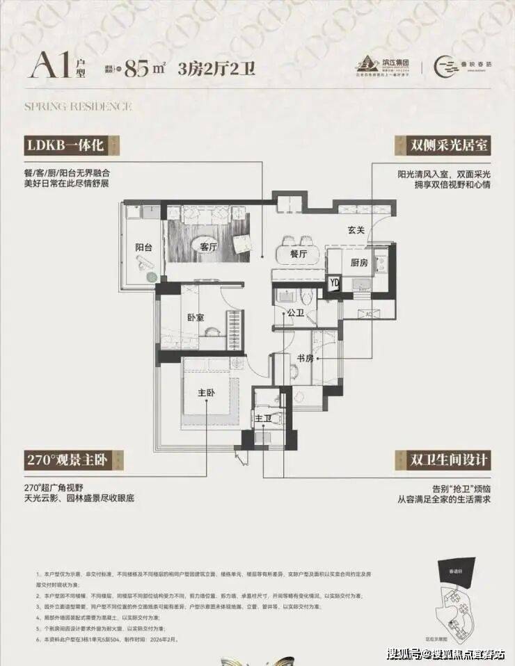 本次首推的主力中的主力。在85㎡面积段做到三房两卫,功能性极强。如果客厅开间能做到约3.3米,主卧带独立卫浴, 对房间数有硬性要求、预算在300-330万左右的家庭相当友好。