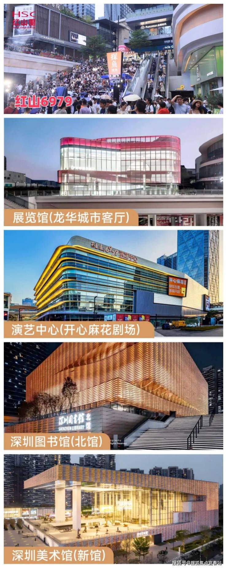 4栋公寓、3栋约5万平办公、1栋1.1万平酒店、6.5万平沉浸开放式街区(200+品牌商家)、1.2万平演艺中心(开心麻花剧场)、约4536平展览馆(龙华城市客厅)、约7.2万平深圳图书馆(北馆)、约6.6万平深圳美术馆(新馆),共约31.4万平的体量,均已在2020年6月-2023年11月期间陆续分阶段开业!