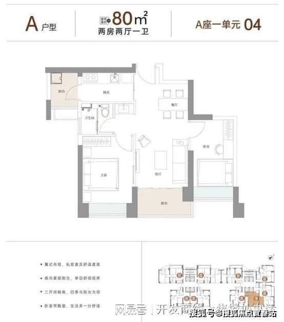 80㎡2 房 2 厅 1 卫:采用竖厅双龙抱珠格局,客厅 3.2 米开间,三开间朝南,一字型厨房带生活阳台,卫生间三段式分离,阳台东南朝向。