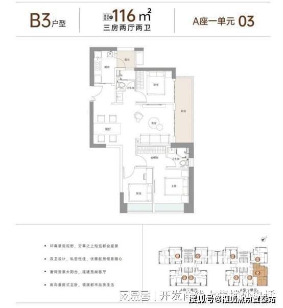 116㎡3 房 2 厅 2 卫:竖厅格局,客厅 3.5 米开间,客餐厅一体化,主卧东南向,客厅连接次卧出巨幕大阳台,L 型厨房带生活阳台,公卫三段式分离,阳台东北朝向。