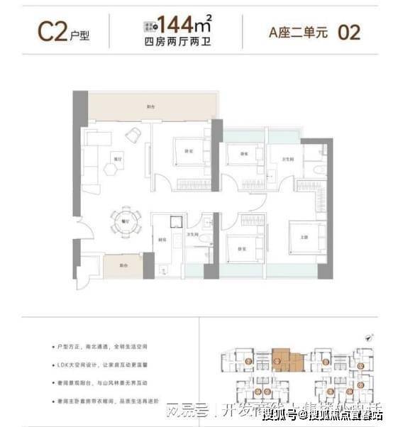 144㎡4 房 2 厅 2 卫:LDK 竖厅格局,客厅 4 米开间,动静分区,南北通透双阳台设计,客厅连接次卧出巨幕大阳台,L 型厨房,卫生间干湿分离,大阳台主朝西北向。