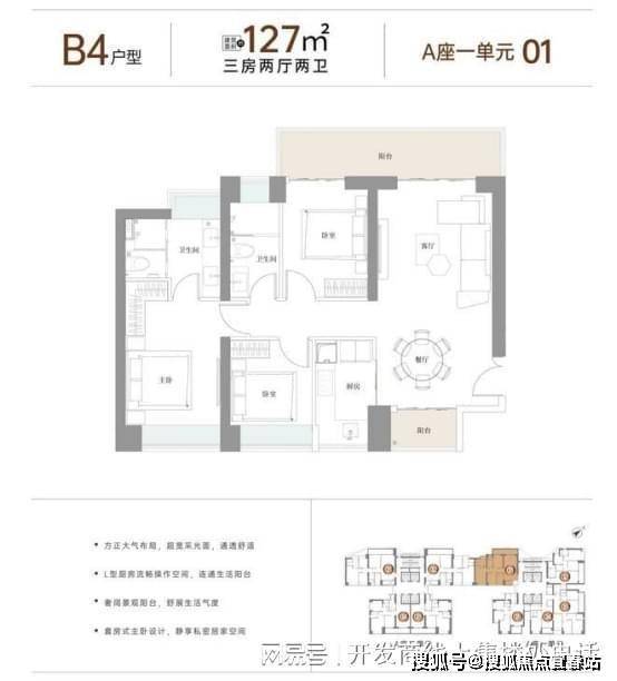 127㎡3 房 2 厅 2 卫:LDK 竖厅格局,客厅 4 米开间,南北通透双阳台,动静分区,客厅连接次卧出巨幕大阳台,L 型厨房,卫生间干湿分离,大阳台主朝西北向。