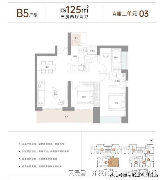 125㎡3 房 2 厅 2 卫:LDK 竖厅格局,客厅 4 米开间,动静分区,三开间朝南,客厅连接次卧出巨幕大阳台,厨房带生活阳台,公卫三段式分离,阳台东南朝向。