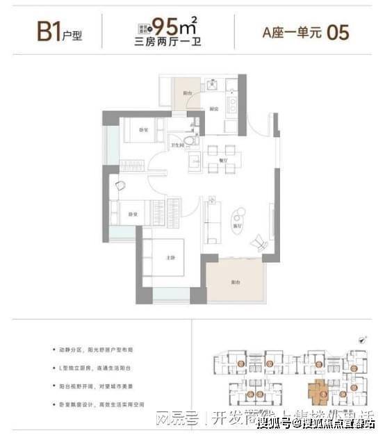 95㎡3 房 2 厅 1 卫:竖厅格局,客厅 3.4 米开间,LDKB 一体化,动静分区,L 型厨房带生活阳台,卫生间三段式分离,阳台东南朝向。