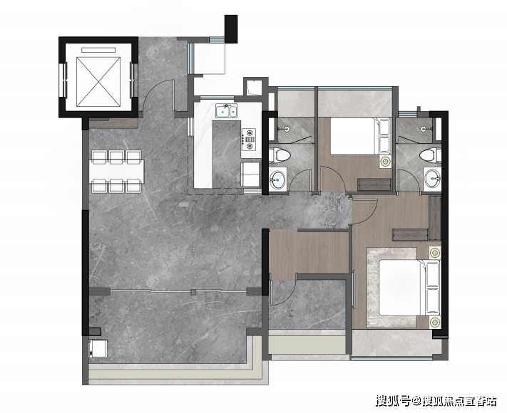 :LDKG世界会客厅设计,南北通透,中西双厨,双套房配置,主卧配270°转角飘窗、独立衣帽间与双台盆卫浴。