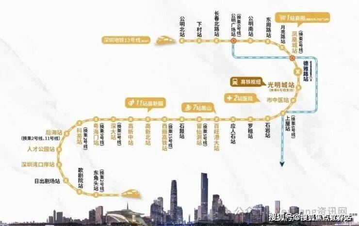 2高铁-国家级铁路枢纽(光明城高铁站)广深港高铁:1站深圳北,2站福田CBD,3站直达香港、广州南