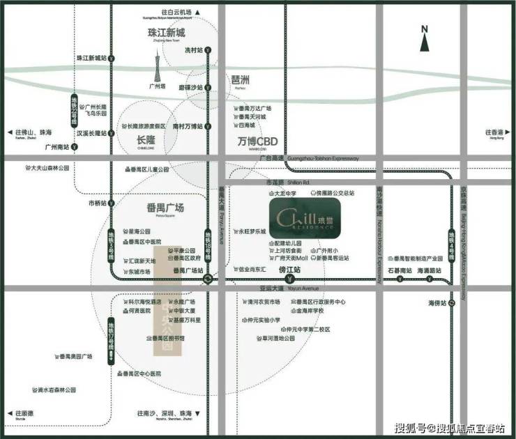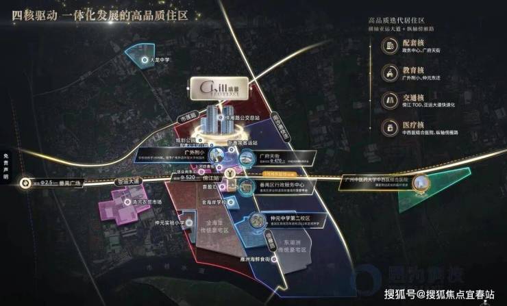 二、中芯 ● 番禺区府新城区府新城板块,旧区府板块的延续和升级版,由配套、教育、交通、医疗四大核心驱动的高品质迭代居住区。