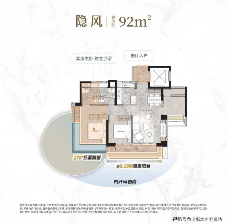 *以上泛会所实拍图,仅供参考,非交付标准八、户型鉴赏【户型1-建面约92㎡】专属私域 | 奢厅入户,尊崇归家仪式极致布局 | 超高可用率,四开间朝南朗阔视野 | 约6.15M阔景阳台,尽揽阳光清风奢享主卧 | 270°巨幕飘窗,无垠景观环绕