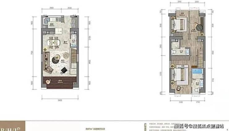 ★88㎡复式两房两厅三卫 双向通透采光,5.4米开间客厅及主卧,双套房周全设计,室内多变空间可根据家庭需要设置独特的功能。