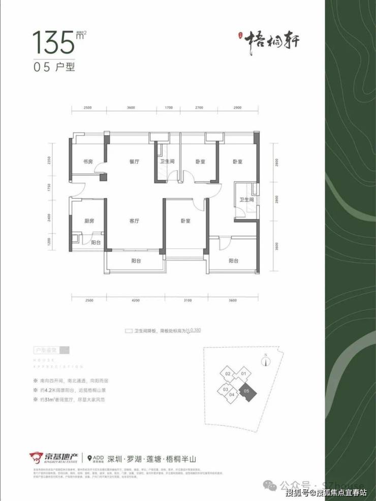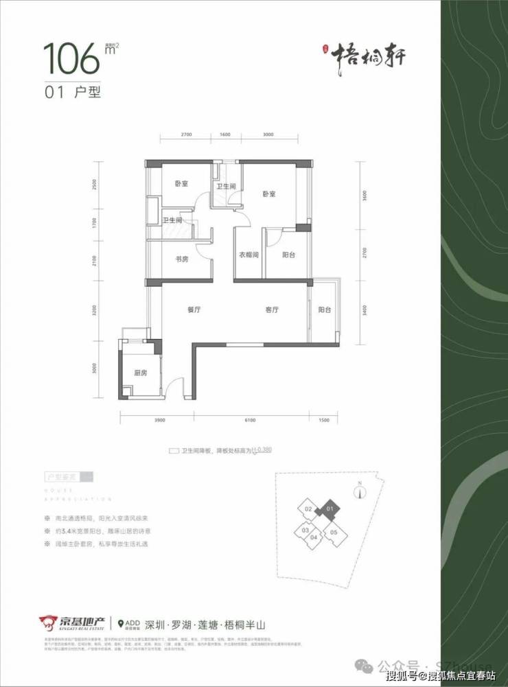 3、精著产品:打造为梧桐半山低密纯住区,约3.31低容积率,约1:1臻贵车位比,2梯5户舒适梯户比,全南朝向、全明采光设计,户型方正实用,高使用率。