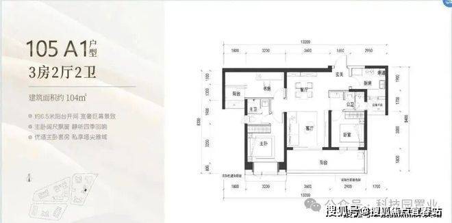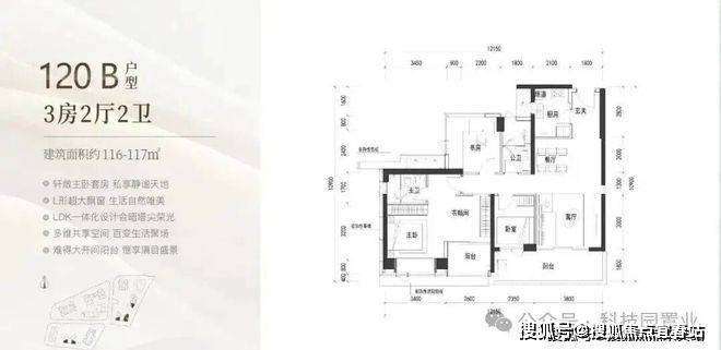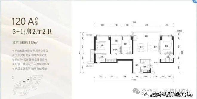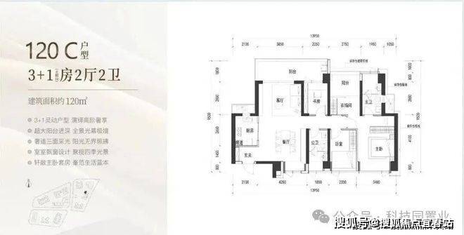 120㎡:客厅与卧室连通9.6㎡超大阳台,主卧带5.2㎡衣帽间,还有观景小阳台,主要为东南和西南朝向