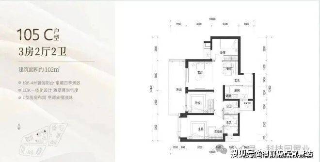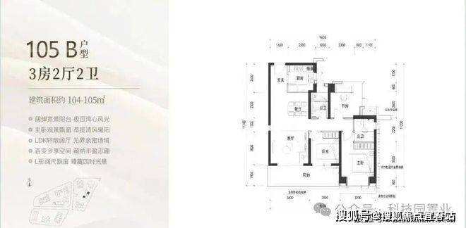 105㎡: 竖厅格局,客厅与卧室连通超大阳台,LDK一体化设计,主卧室270度转角飘窗,看城市景观,主要朝向为西南和东南