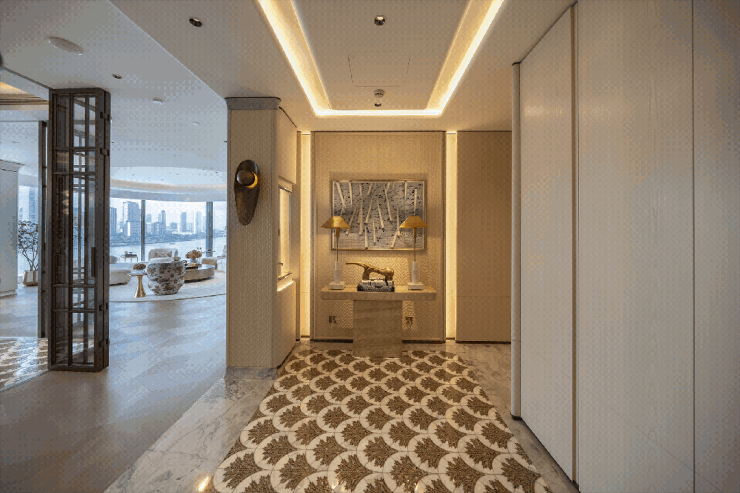• 细节较真到离谱:弧形墙面不用拼接工艺,直接整块意大利洞石切割;实木地板要进实验室做7天7夜温湿循环测试,就为了适应江畔环境;电视背景墙用普拉达绿奢石,卫生间铺香格里拉翡翠、米兰红奢石,嘉格纳电器、德国雅生龙头、土耳其巴斯蒂姆五金,全是行业顶尖品牌;