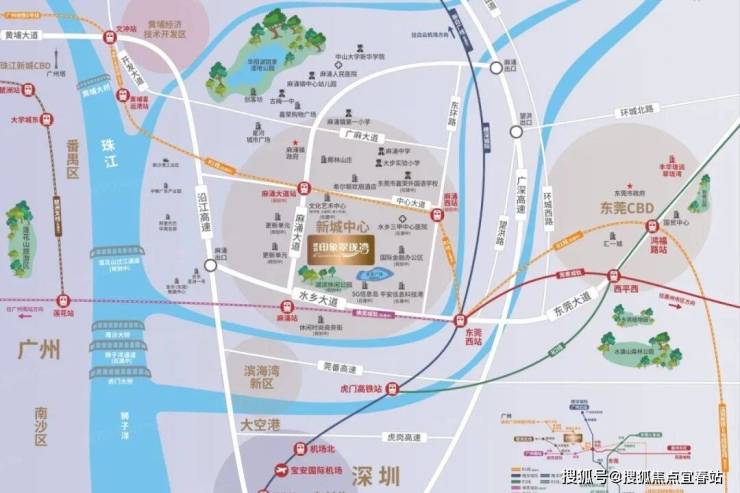 两高速:广深高速和广深沿江高速 距沿江高速麻涌收费站约约5分钟车程,北往广州,约30分钟直达广州CBD,南往深圳宝安、前海,约40分钟到达宝安机场;