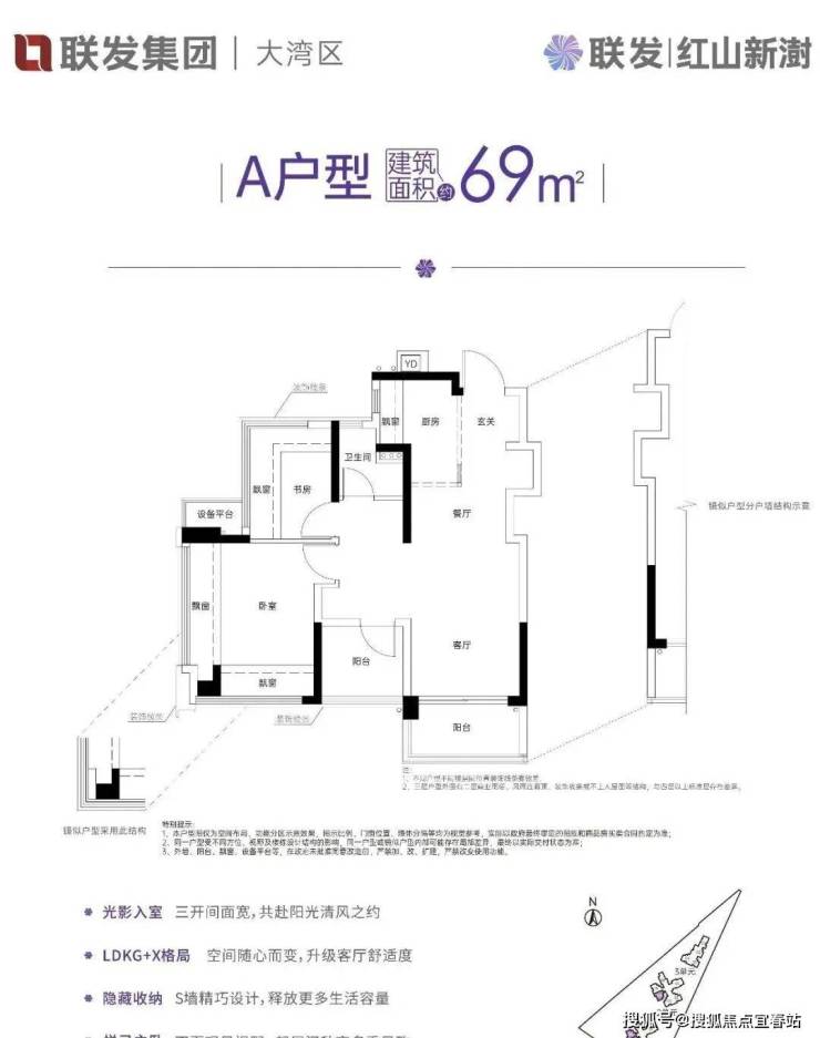 约69㎡的2+1房2厅1卫,设计的是竖厅LDKG+X格局,S墙设计预留冰箱卡槽位,做到了主卧双飘窗,三开间朝南,动静分区,U型大厨房,厨房烟道还做了外置空间,可以更好的利用厨房空间,卫生间三段式干湿分离。赠送了双阳台一半面积+5面飘窗+1个设备平台,超100%得房率,西南朝向。这是整个红山板块上车门槛最低的3房。