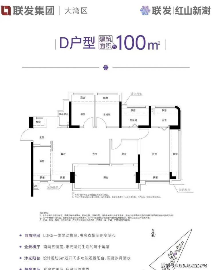 约100㎡的4房2厅2卫,设计的是横厅南北通透格局,独门独户还有私用公区,LDKG一体化灵动设计,做到了主卧双飘窗,五开间朝南,动静分区,U型大厨房,厨房烟道还做了外置空间,可以更好的利用厨房空间,卫生间干湿分离。赠送了阳台一半面积+9面飘窗+1个设备平台,超100%得房率,长约6米的大阳台主朝东南向。这是红山板块同面积段仅有的户型格局,整个红山只有46套。