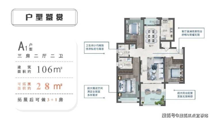 〖A1户型〗建筑面积:约106㎡拓展面积:约28㎡户型格局:三室二厅二卫(可改3+1房)