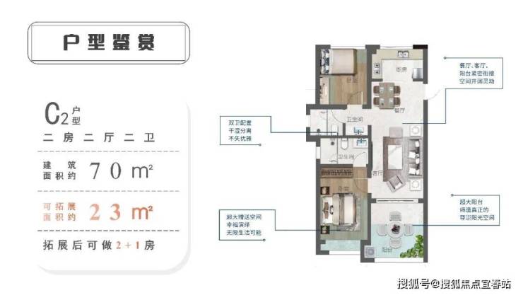 〖C2户型〗建筑面积:约70㎡拓展面积:约24㎡户型格局:二室二厅二卫(可改2+1房)