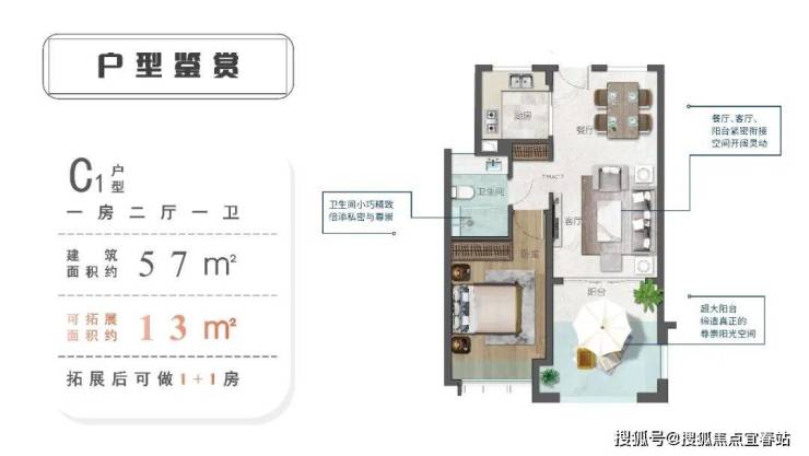 〖C1户型〗建筑面积:约57㎡拓展面积:约13㎡户型格局:一室二厅一卫(可改1+1房)