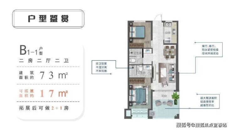 〖B1-1户型〗建筑面积:约73㎡拓展面积:约17㎡户型格局:二室二厅二卫(可改2+1房)