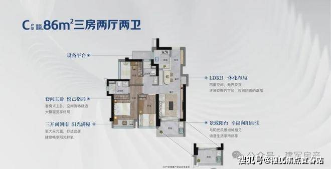 86㎡的3房2厅2卫,设计的是经典竖厅格局,客厅3.2米开间,入户玄关八宝库,LDKB一体化,S墙设计预留冰箱卡槽位,动静分区,三开间朝南,U型厨房,公卫三段式分离,还送1个设备平台,得房率约75.9-76.6%(不含赠送),西南或东南朝向。