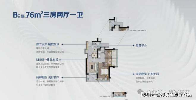 76㎡的3房2厅1卫,设计的是竖厅格局,客厅3.05米开间,入户玄关八宝库,LDKB一体化,S墙设计预留冰箱卡槽位,U型厨房,卫生间三段式分离,还送1个设备平台,得房率约75.9-76.6%(不含赠送),1单元01户型东南朝向,2单元01户型西南朝向,05.06户型东北朝向。