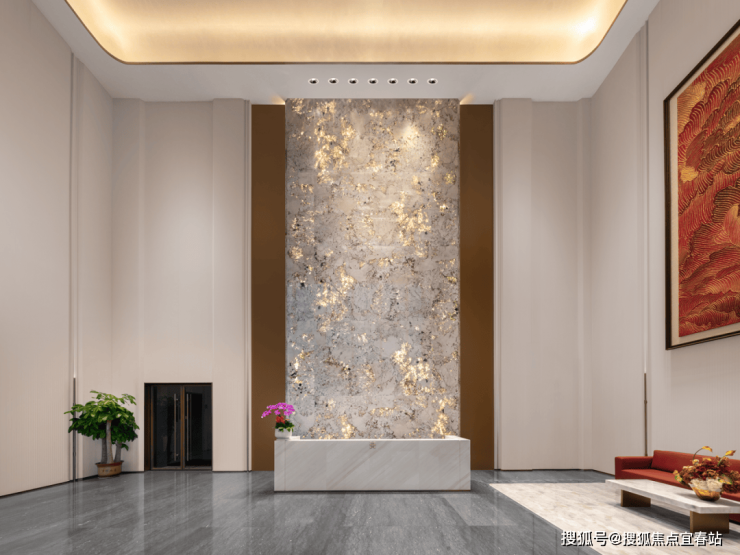 从社区主入口的酒店式归家大堂开始,体验便不同凡响。意大利宝格丽奢石接待台、巴西潘多拉透光奢石背景墙、约9米挑高的弧顶艺术涂料天花板与牡丹油画挂画,共同营造出入户的尊崇仪式感。两侧对植的约20年树龄造型冬青,以盎然生机寓意“基业长青”,仪式感与归属感自此油然而生。