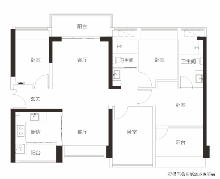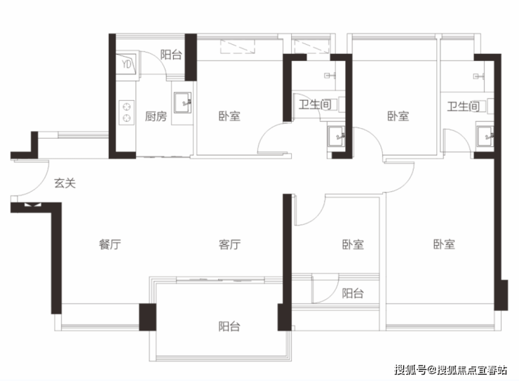 【3栋4栋01/02户型96㎡3房2卫】 客厅朝南带阳台,2房朝南,1房朝西/东