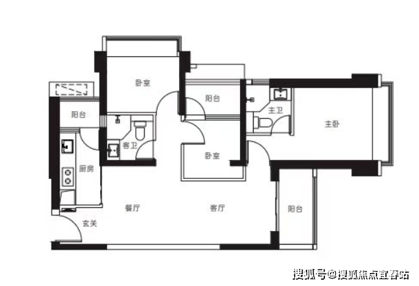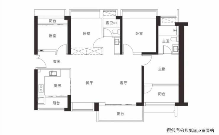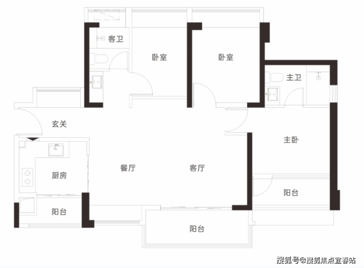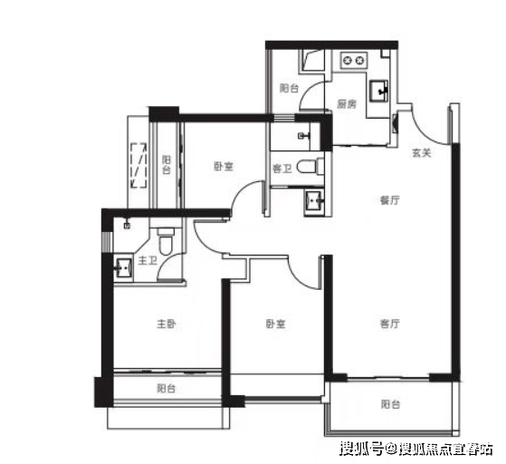 【3栋4栋03户型107㎡3房2卫】 客厅横厅朝南带阳台,主卧朝南,2房朝北