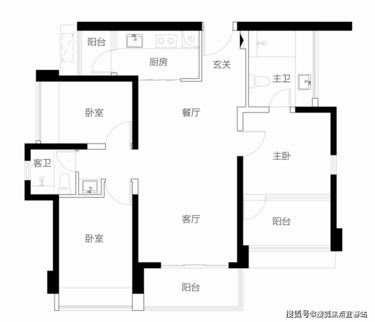 【104㎡3房2卫户型】双龙抱珠户型,奢阔舒适三房全明户型,三面采光,看中心园林景观