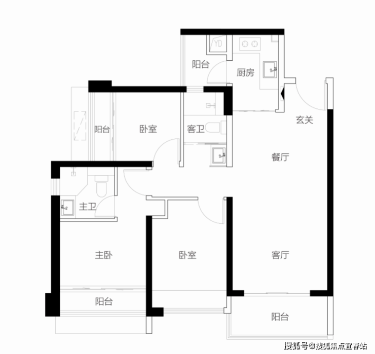 【1栋2栋01户型94㎡3房2卫】 客厅朝东带阳台,主卧朝东,2房朝北