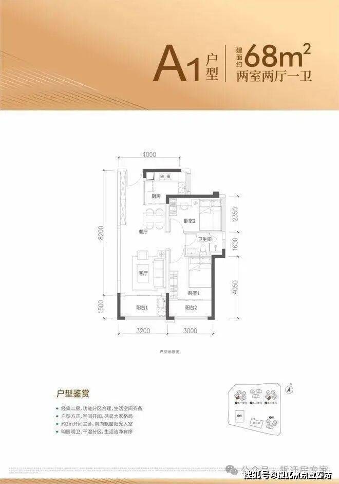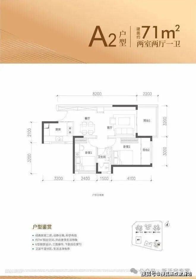 设计的是竖厅格局,客厅3.2米开间,进深8.2米,LDKB一体化设计,2个卧室分别做到了主卧12.5㎡/次卧9.12㎡(包含墙体飘窗),U型厨房,卫生间干湿分离,得房率约79%(不含赠送),东南朝向.