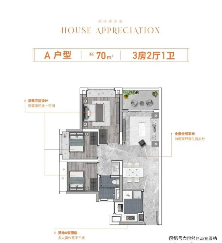 项目拥有约70㎡极致三房,是片区内面积最小的三房户型。在同等面积段中,手握小户型与多一房空间双重优势,让你劲省20万,置业门槛更低!近9成空间实用率,突破空间使用极限,真正地实现“小面积,大享受”。