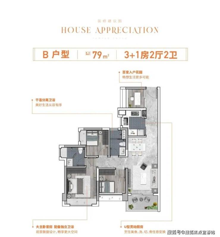 建面约79㎡的3+1房2厅2卫三开间朝南 ,带大主卧主套,使用率超高。阔景阳台正南拥揽中央园林景色 ,清风阳光相伴左右,园林景观环绕生活,让品质与舒适 早已融入生活。