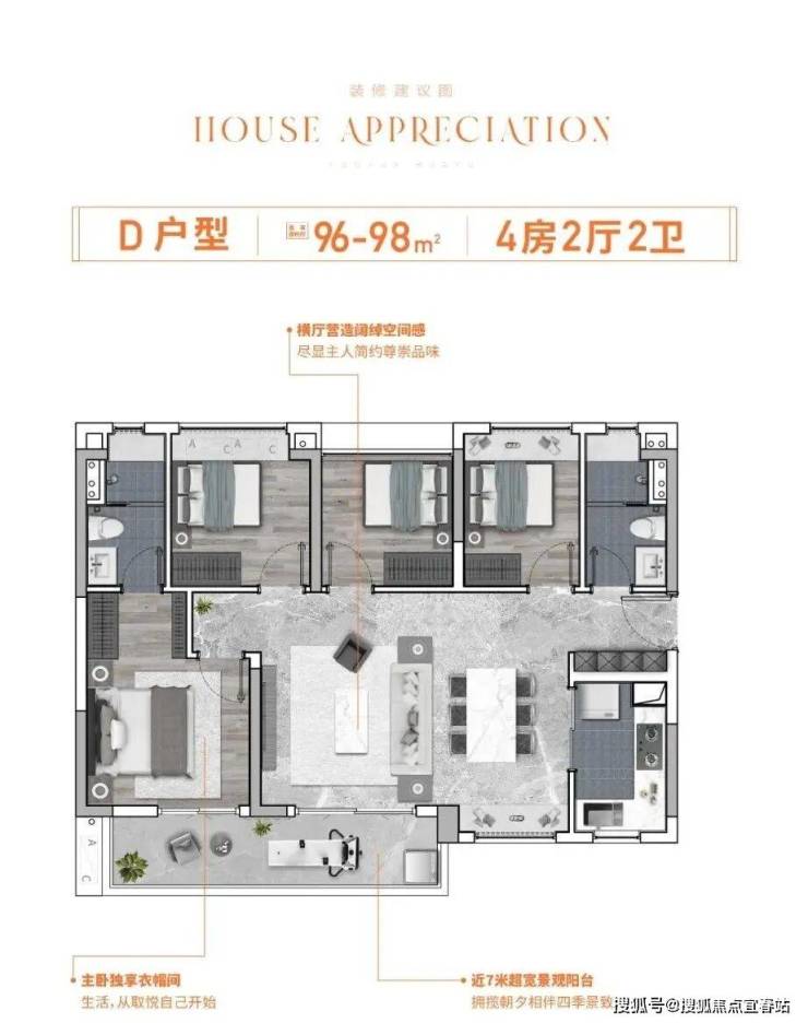 随着三孩时代来临,四房户型需求越来越多。建面约96-98㎡4房2厅2卫 ,孩子们的健康成长乐园!约7㎡超长观景阳台 ,连接客厅与主卧,奢享生活的尺度。一体化的客餐厨 ,气派程度媲美建面约120㎡中大户型 。