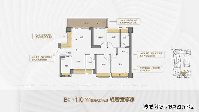 约6.5米双开间大阳台,主卧大套间设计,搭配独立卫生间、步入式衣帽间;全屋9处飘窗,南北通透,采光通风俱佳。