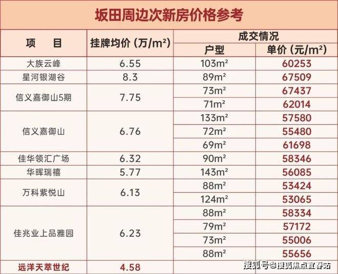 坂田目前次新房的价格挂牌价基本在6-7万/㎡区间,成交价5-6万/㎡,比远洋天萃相比高8000+元/㎡(用次新房最低成交单价53065元/㎡计算)的价差。