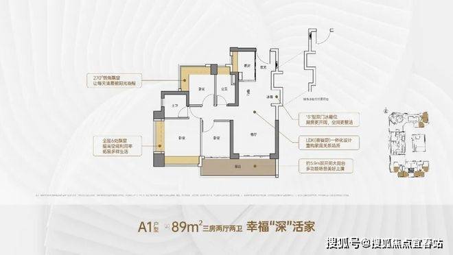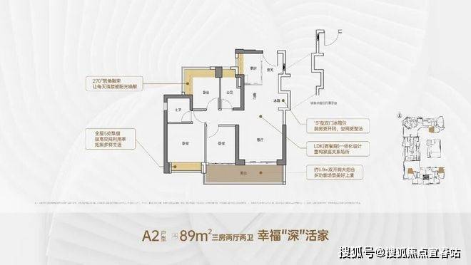 客厅3.5米开间,LDK一体化,客厅连接次卧出5.9米双开间大阳台,次卧270°转角飘窗。